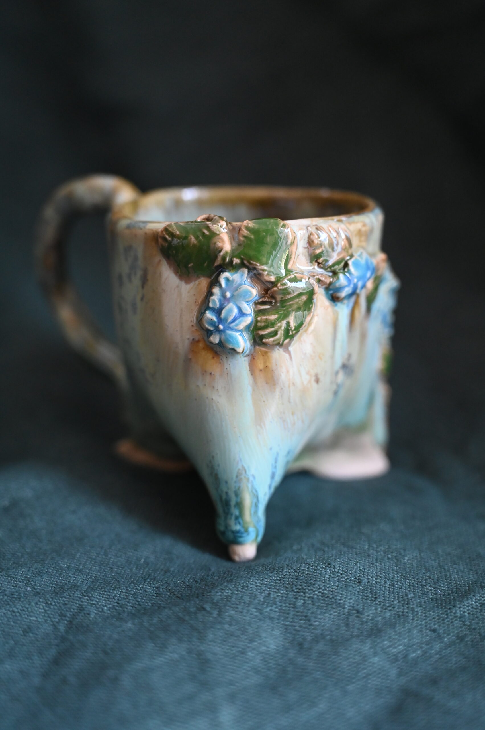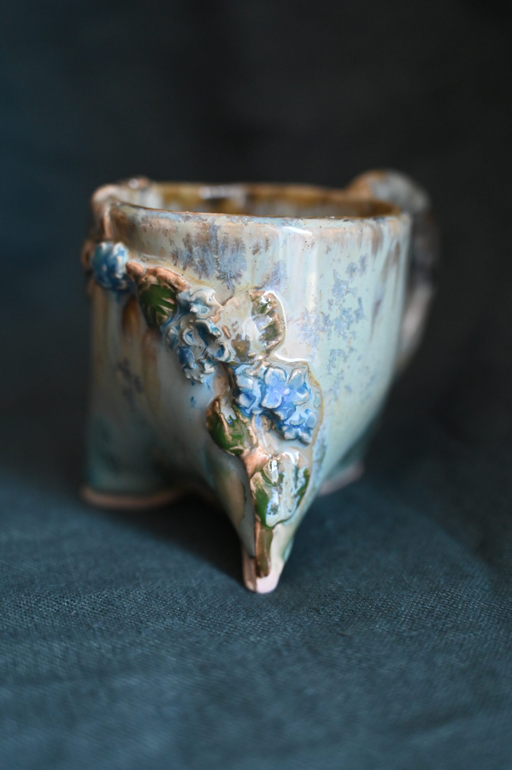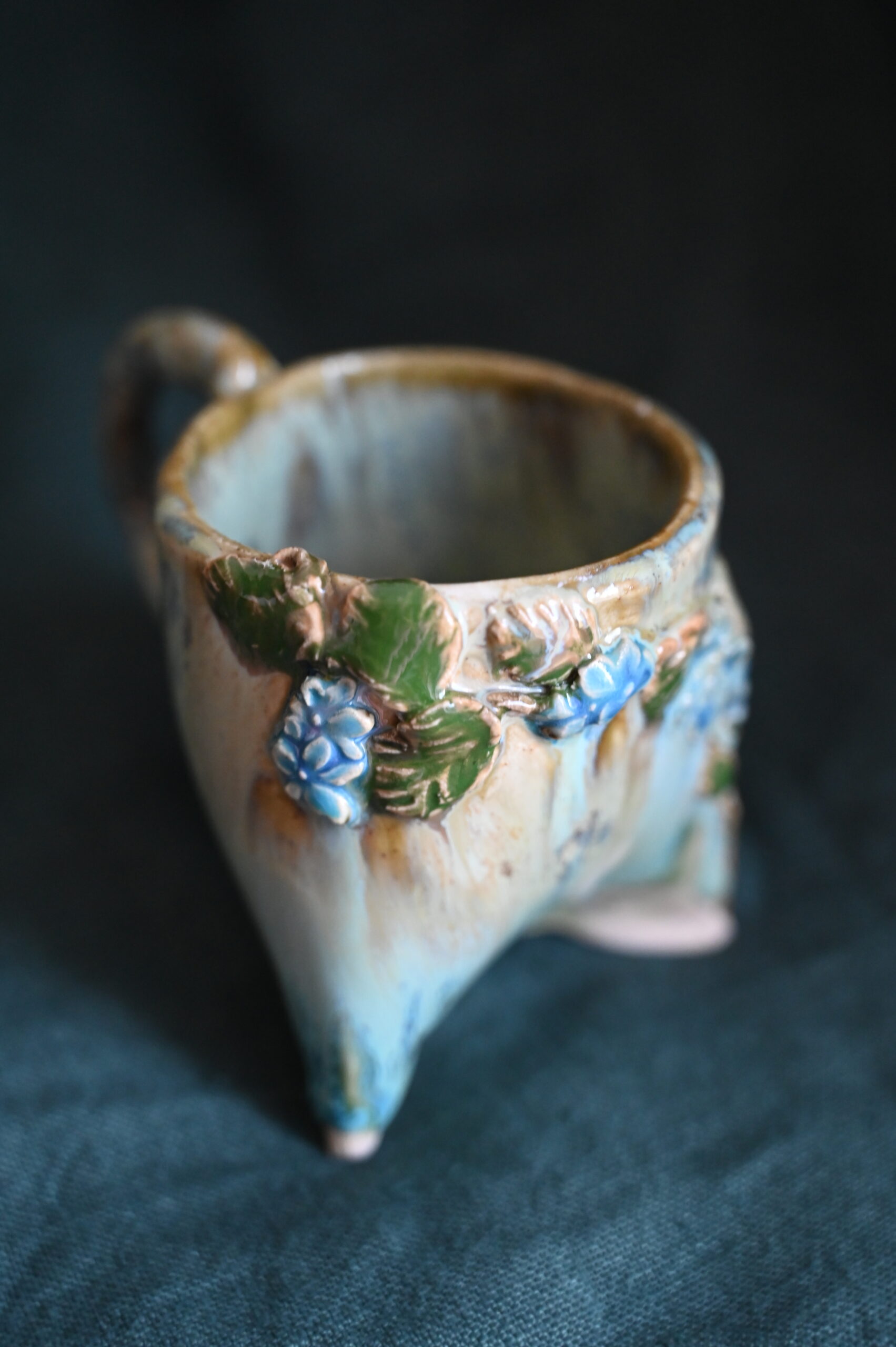 Kubek jak z powieści Jane Austen. Romantyczny, filigranowy, na trzech nóżkach. Beżowo-niebieski, jak niebo w cichą, wiosenną noc. Z przodu – gałązki z drobnymi niebieskimi kwiatkami i zielonymi listkami. Może to niezapominajki, a może coś, co zapamiętasz na długo.