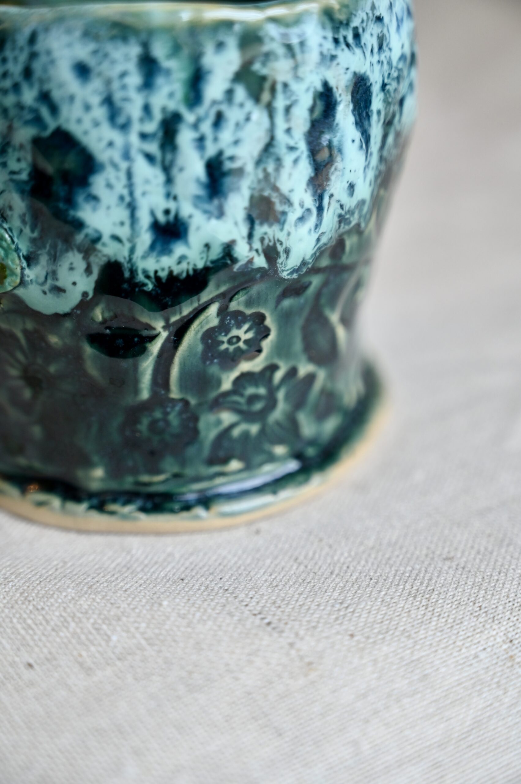 Każdy inny, barwny i pełen ruchu. Pną się po kubku wśród kwiatów, na tle szkliwa w głębokim odcieniu nieba tuż po burzy.