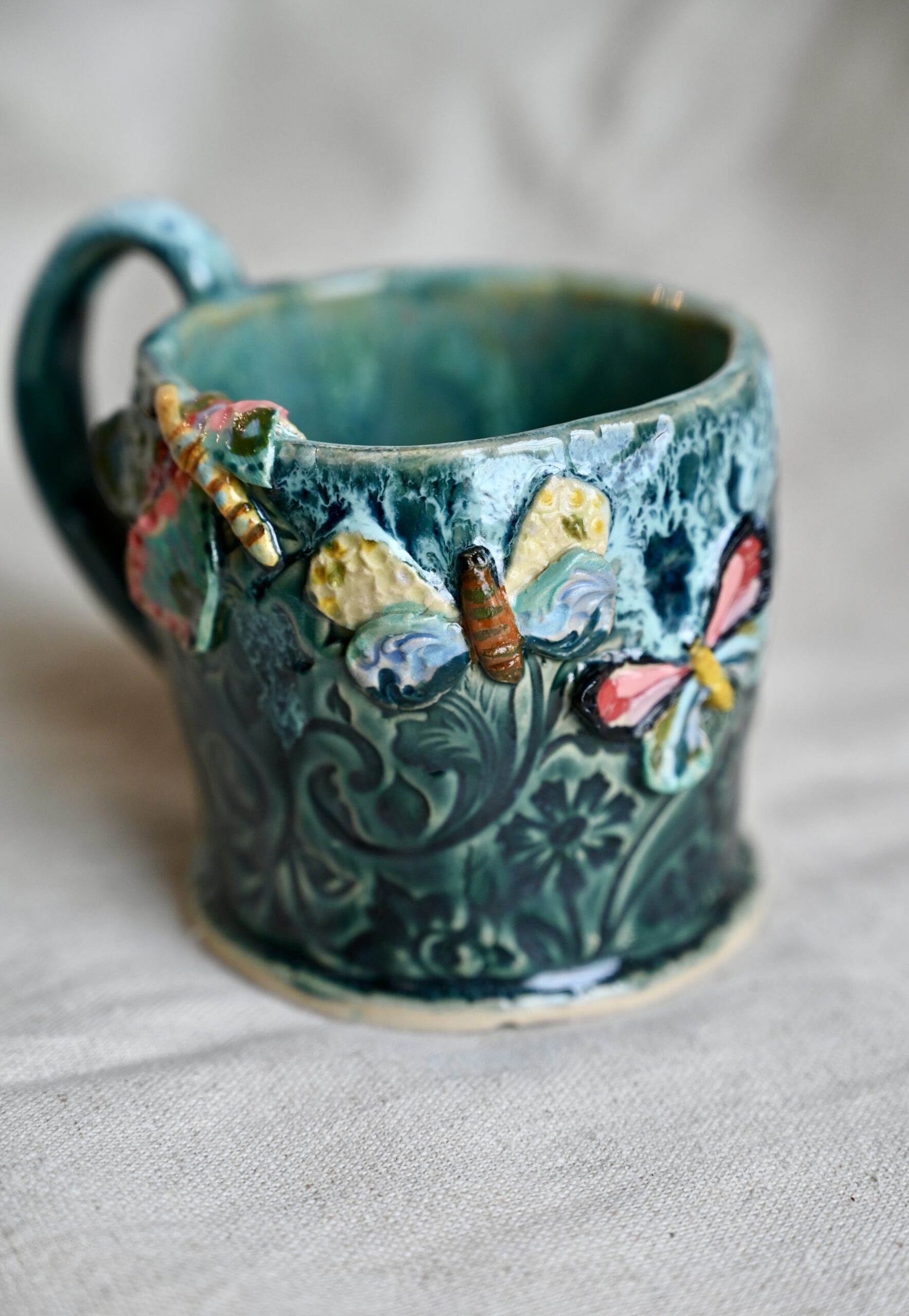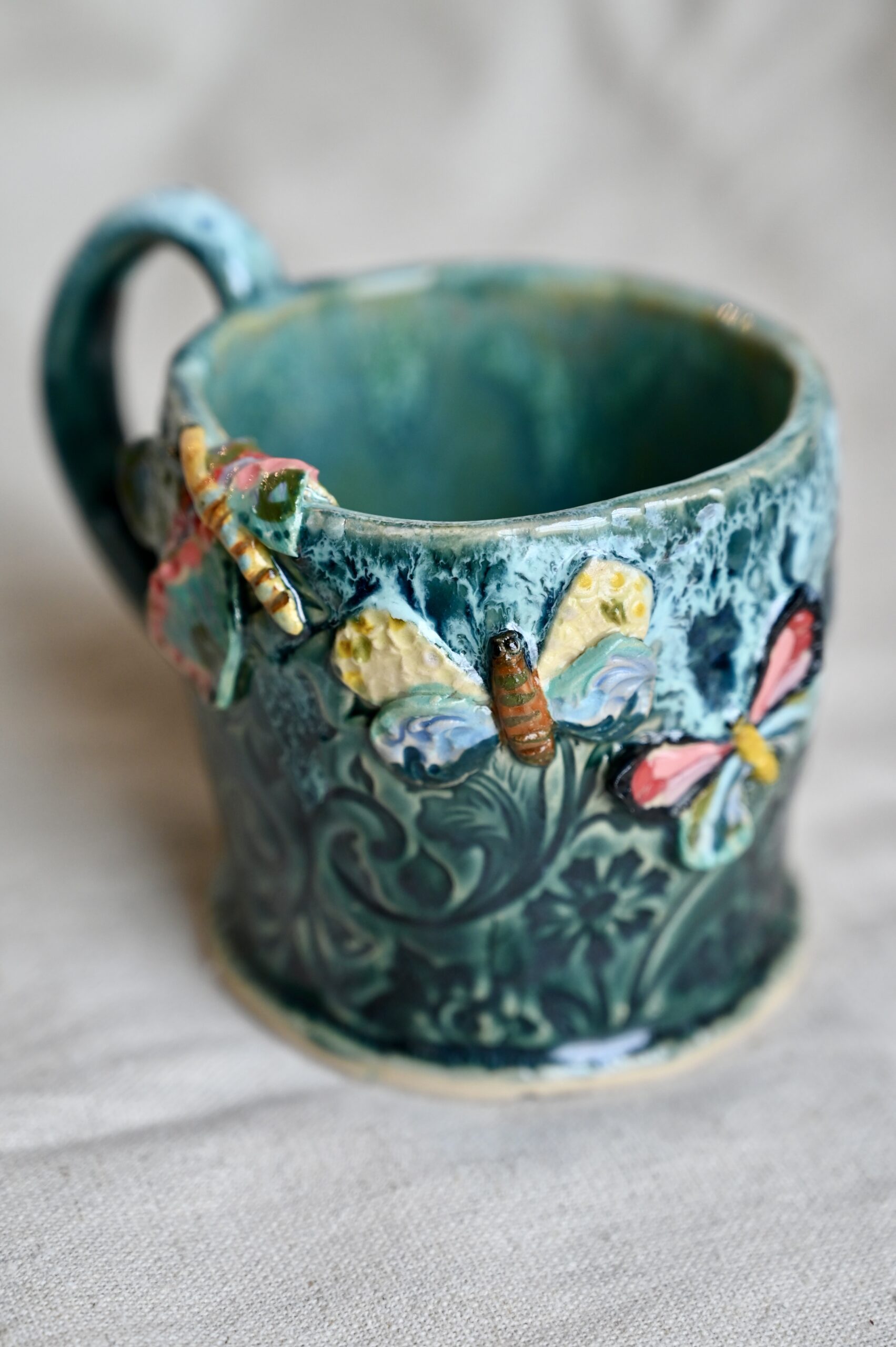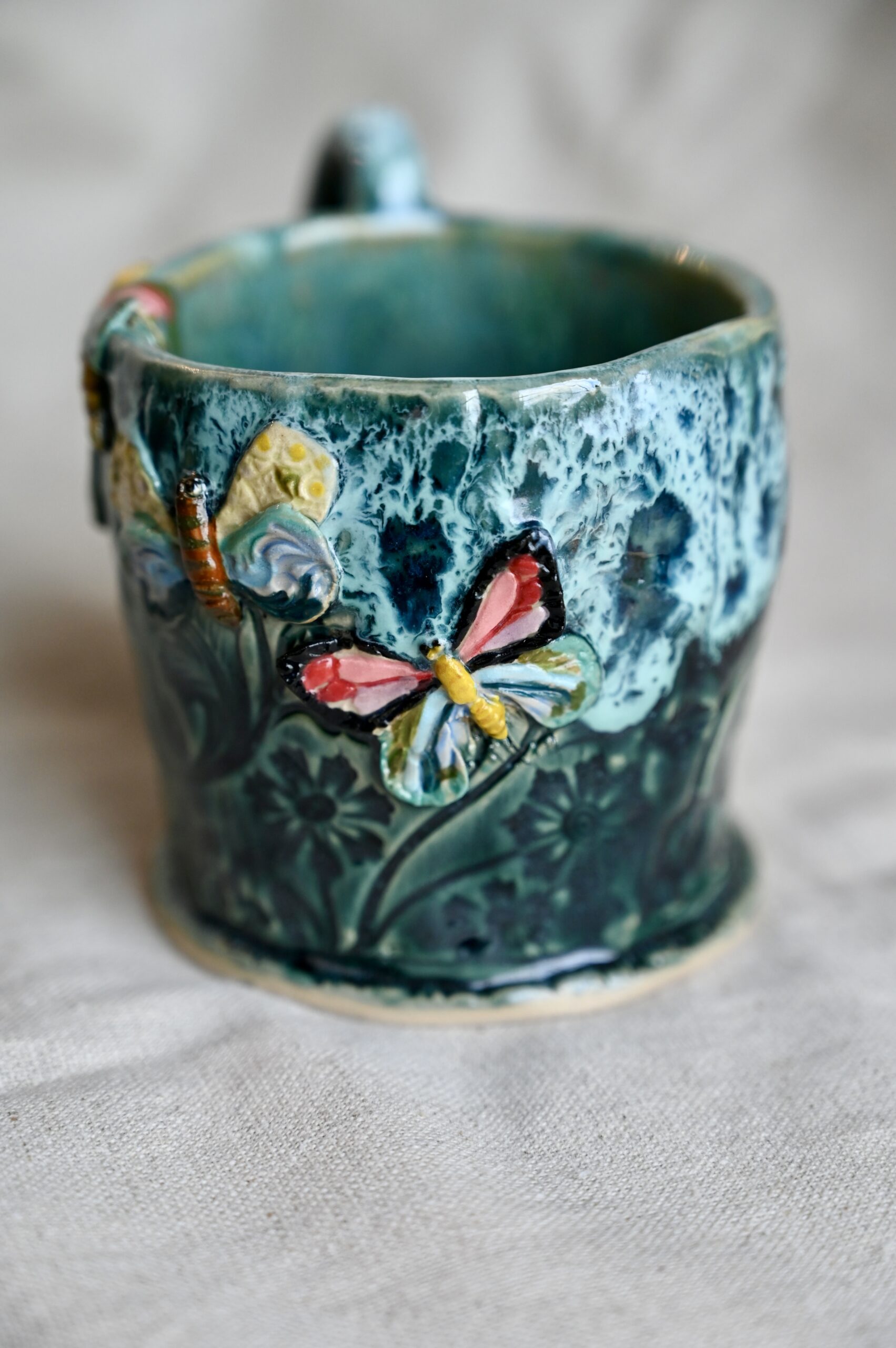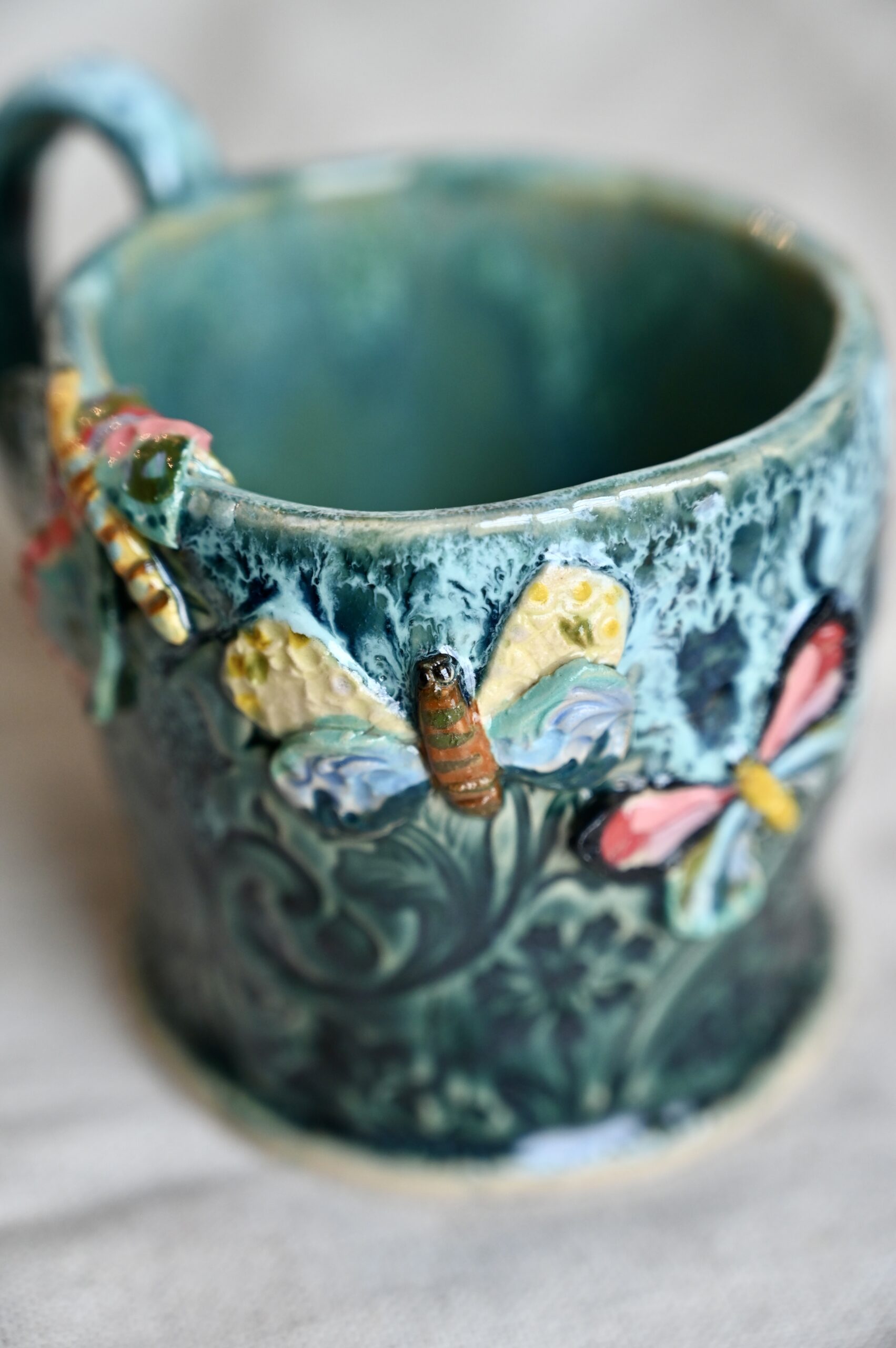 Ręcznie lepiony, szkliwiony z dbałością o każdy szczegół — z motylami, które wyglądają, jakby zaraz miały odlecieć.